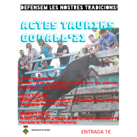 FESTES MAJORS | Actes Taurins, Godall 2021 DIA 4 AGOST DIMECRES 18,30 h Tarda de vaques i bous a càrrec de la ramaderia Hilario Príncep Martinez. A continuació bou embolat a càrrec de la mateixa ramaderia. Lloc: plaça portàtil situada a l'esplanada de la plaça de bous municipal. DIA 5 AGOST DIJOUS...